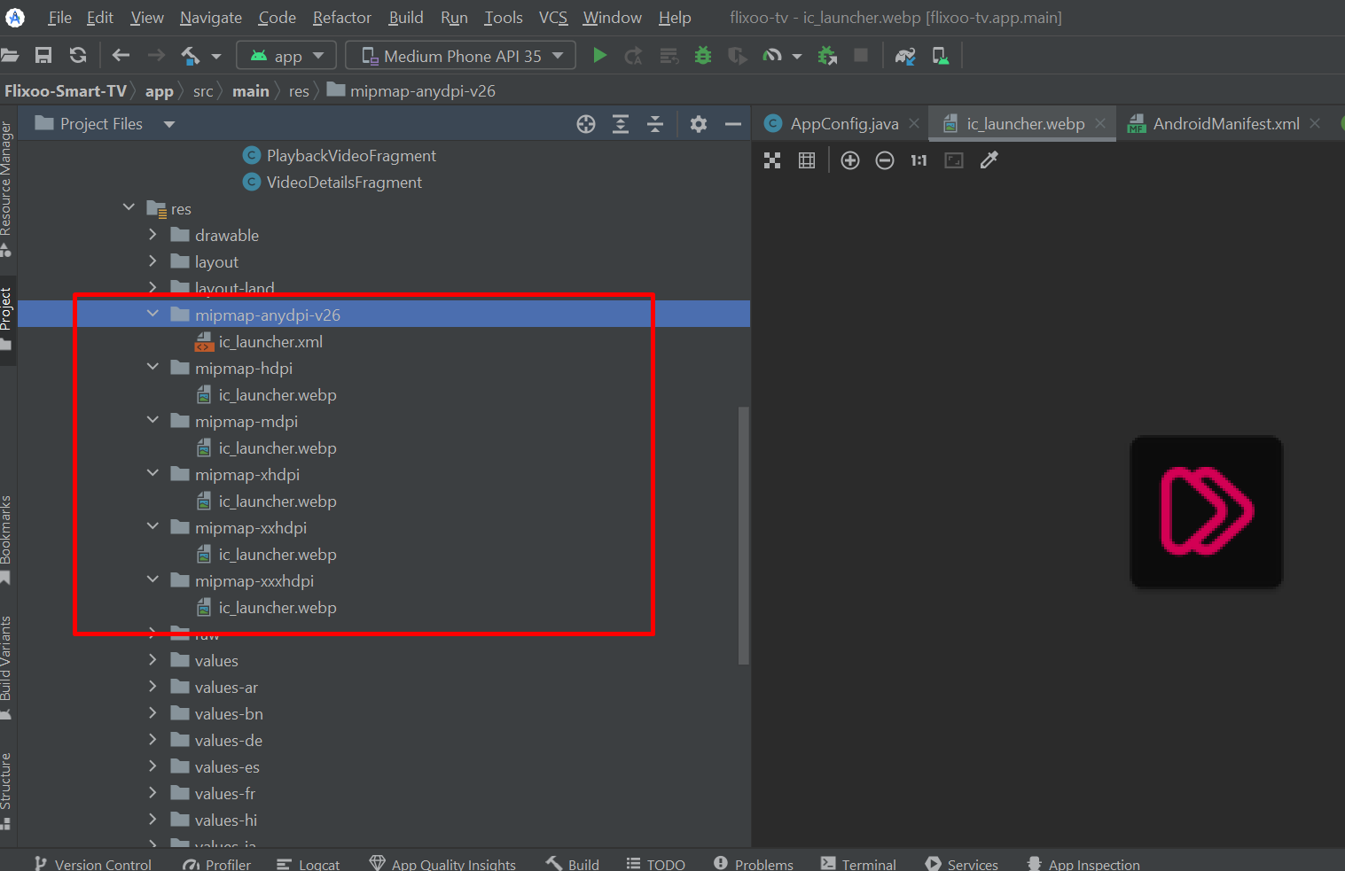 - Launcher icon: Open Android Studio > app > res > drawable > ic_launcher_tv.png(Recommanded size 537x302)